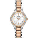 The Bulova Diamonds 98R272 is a women's watch that exudes luxury and refinement in every detail. The 28 mm case is made of high-quality stainless steel with a warm rose gold finish, which gives the watch an elegant and modern look. The mother-of-pearl dial is beautifully accentuated by sparkling diamonds that are carefully placed as hour markers. This gives the watch an exclusive and feminine look that completes every outfit.